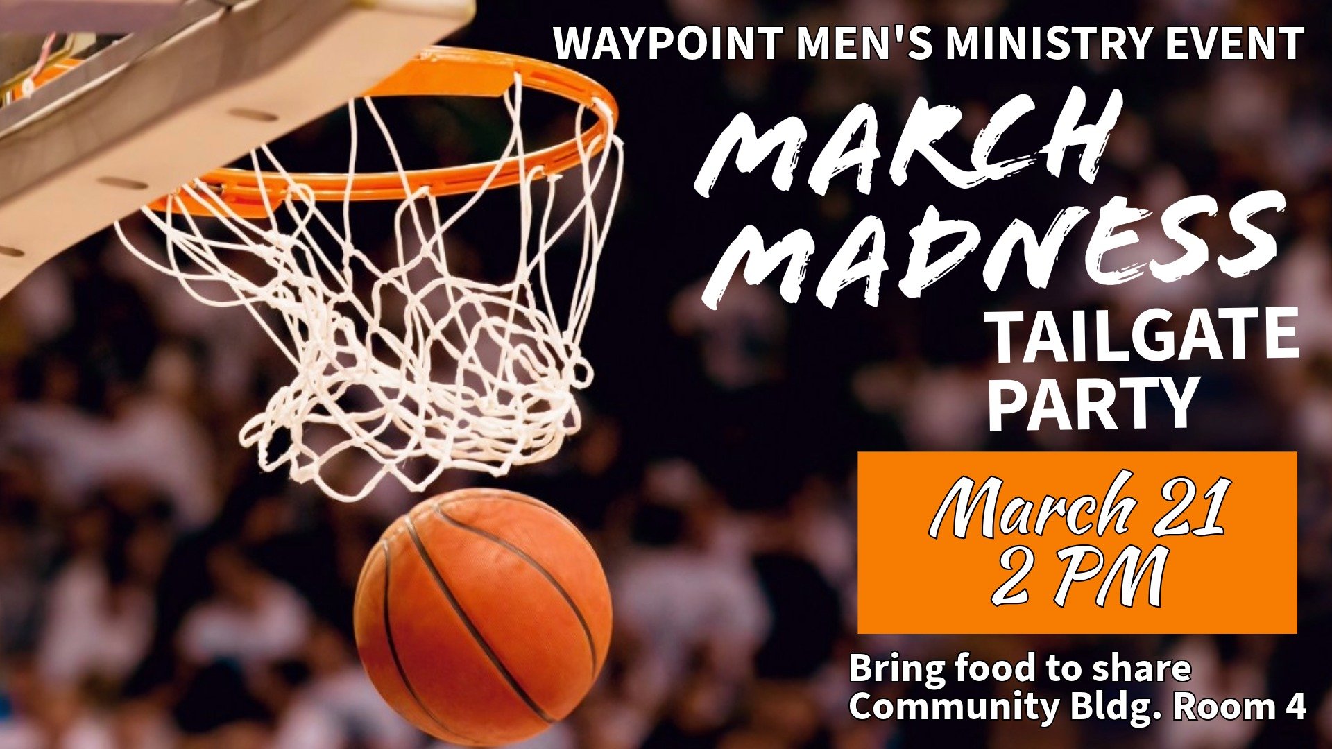Men's March Madness Tailgate Party Saturday, March 21, 2026 2:00 PM 6:00 PM 14:00 18:00 Waypoint Church 25335 Fulshear-Gaston Road Richmond, TX, 77406 United States (map) Google Calendar ICS Come when you can & leave when you need. Bring a food item and soft drinks to share.